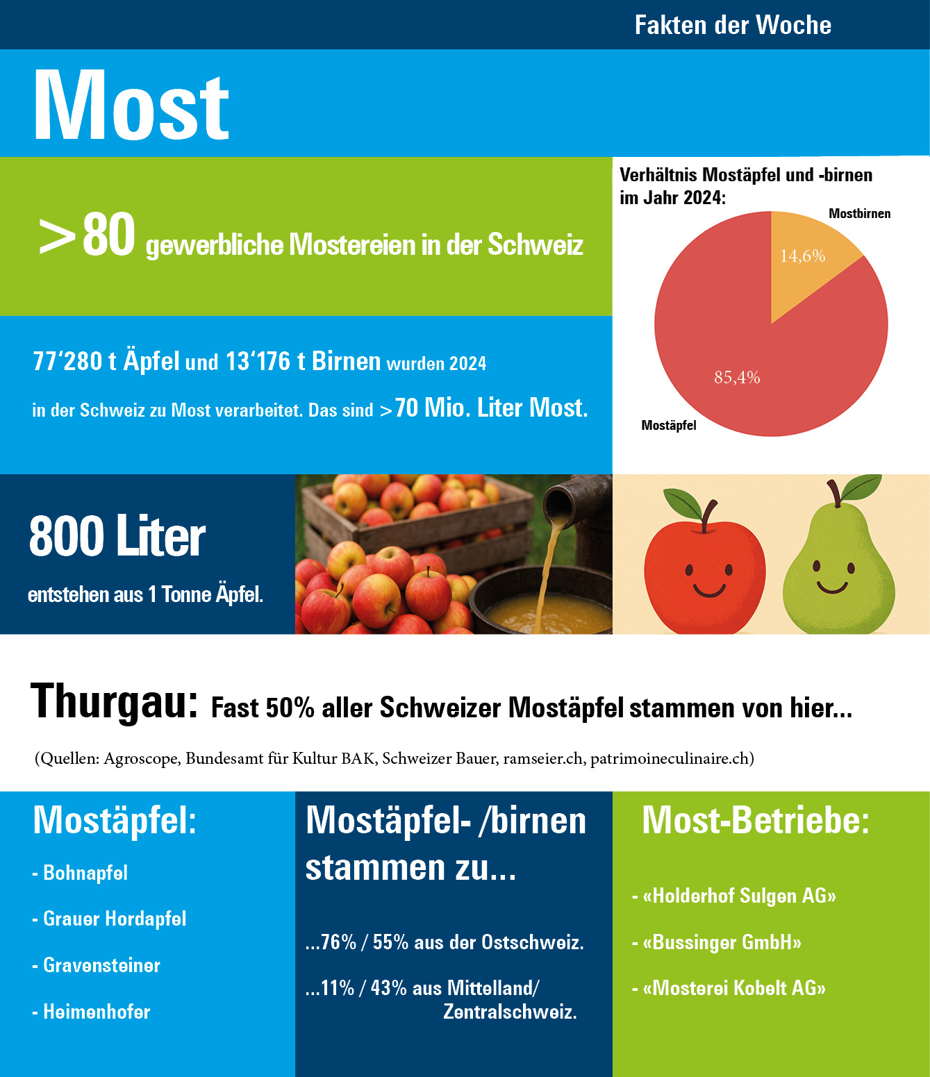 Und die Werbung stimmt: Im Jahr 2023 gab es allein im Thurgau gut 60 Lohn- und Kundenmostereien. Rund 75 Prozent der Mostäpfel und 55 Prozent der Mostbirnen, die in der Schweiz verarbeitet werden, stammen aus der Ostschweiz. Aus dem Kanton Thurgau stammt jeder 3. Tafelapfel in unserem Land.
